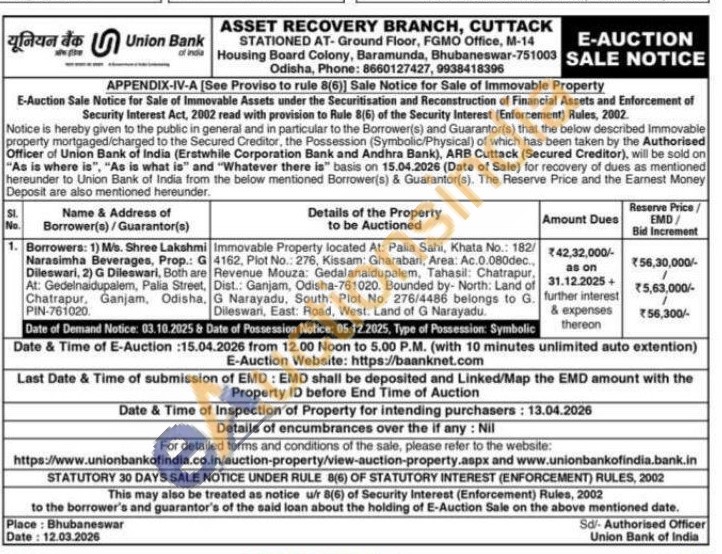 Immovable Property located At: Palia Sahi, Khata No.: 182/G 4162, Plot No.: 276, Kissam: Gharabari, Area: Ac.0.080dec.. are Revenue Mouza: Gedalanaidupalem, Tahasil: Chatrapur, , Dist.: Ganjam, Odisha-761020. Bounded by- North: Land of . G Narayadu, South: Plot No. 276/4486 belongs to G. Dileswari, East: Road, West: Land of G Narayadu.