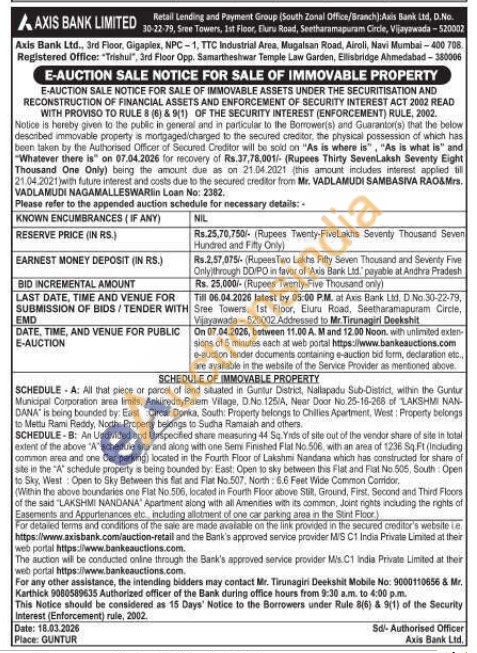 SCHEDULE-A: All that piece or parcel of land situated in Guntur District, Nallapadu Sub-District, within the Guntur Municipal Corporation area Imits, AnkuireddyPalem Vilage, D.No 125/A, Near Door No.25-16-268 of LAKSHMI NAN-DANA is being bounded by: East Circar Donka, South: Property belongs to Chillies Apartment, West: Property belongs to Mettu Rami Reddy, North: Property belongs to Sudha Ramalah and others. SCHEDULE-B: An Undivided and Unspecified share measuring 44 Sq. Yids of stle out of the vendor share of side in botal extent of the above "A" schedule site and along with one Semi Finished Flat No. 506, with an area of 1236 Sq.Ft (Including common area and one Car parking) located in the Fourth Floor of Lakshmi Nandana which has constructed for share of site in the "A" schedule property is being bounded by: East: Open to sky between this Flat and Fat No 505, South: Open to Sky, West: Open to Sky Between this flat and Flat No.507, North: 6.6 Feet Wide Common Corridor, (Within the above boundaries one Flat No 506, located in Fourth Floor above Still, Ground, First. Second and Third Floors of the said "LAKSHMI NANDANA" Apartment along with all Amenities with its common, Joint rights including the rights of Easemerits and Appurtenances etc including allotment of one car parking area in the Stint Floor
