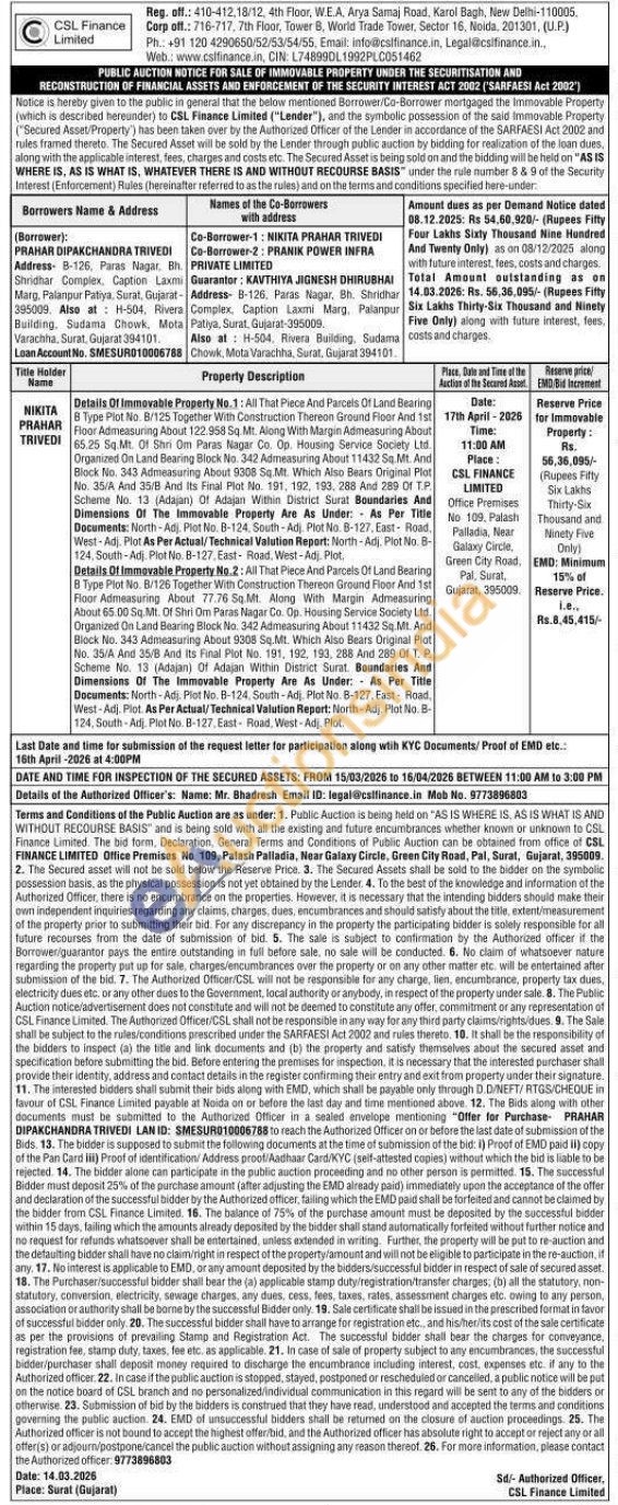 Details Of Immovable Property No.1: All That Piece And Parcels Of Land Bearing 8 Type Plot No. B/125 Together With Construction Thereon Ground Floor And 1st Floor Admeasuring About 122.958 Sq. Mt. Along With Margin Admeasuring About 65.25 Sq.Mt. Of Shri Om Paras Nagar Co. Op. Housing Service Society Ltd. Organized On Land Bearing Block No. 342 Admeasuring About 11432 Sq.Mt. And Block No. 343 Admeasuring About 9308 Sq.Mt. Which Also Bears Original Plot No. 35/A And 35/B And Its Final Plot No. 191, 192, 193, 288 And 289 Of T.P. Scheme No. 13 (Adajan) Of Adajan Within District Surat Boundaries And Dimensions Of The Immovable Property Are As Under: As Per Title Documents: North-Adj. Plot No. B-124, South-Adj. Plot No. B-127, East Road, West-Adj. Plot As Per Actual/Technical Valution Report: North-Adj. Plot No. B-124, South-Adj. Plot No. B-127, East Road, West-Adj. Plot,