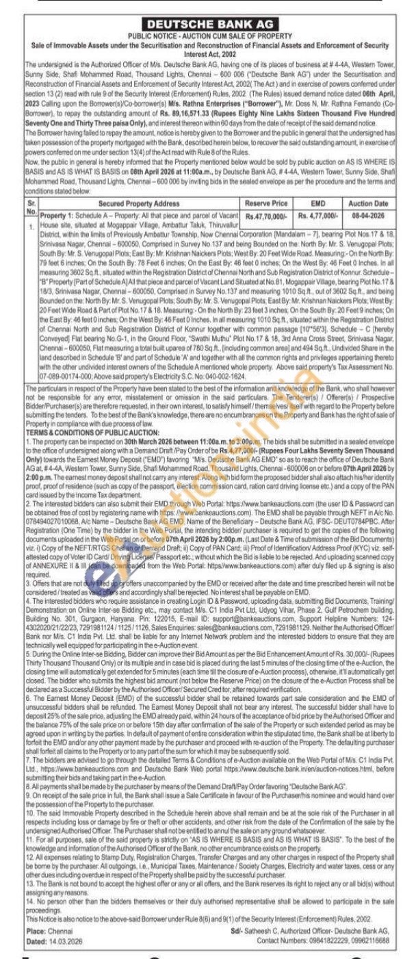 Schedule A-Property: All that piece and parcel of Vacant House site, situated at Mogappair Village, Ambattur Taluk, Thiruvallur District, within the limits of Previously Ambattur Township, Now Chennai Corporation (Mandalam-7), bearing Plot Nos. 17 & 18 Srinivasa Nagar, Chennai-600050, Comprised in Survey No. 137 and being Bounded on the: North By: Mr. S. Venugopal Plots: South By: Mr. S. Venugopal Plots; East By: Mr. Krishnan Naickers Plots: West By: 20 Feet Wide Road. Measuring-On the North By 79 feet 6 inches. On the South By: 78 Feet 6 inches, On the East By: 46 feet 0 inches, On the West By: 46 Feet 0 Inches. In all measuring 3602 Sq. ft., situated within the Registration District of Chennai North and Sub Registration District of Konnur. Schedule-"B" Property [Part of Schedule Al All that piece and parcel of Vacant Land Situated at No.81, Mogappair Village, bearing Plot No. 17 & 18/3, Srinivasa Nagar, Chennai-600050, Comprised in Survey No. 137 and measuring 1010 Sq.ft., out of 3602 Sq.ft and being Bounded on the: North By: Mr. S. Venugopal Plots: South By: Mr. S. Venugopal Plots, East By: Mr. Krishnan Naickers Plots, West By: 20 Feet Wide Road & Part of Plot No. 17 & 18. Measuring: On the North By: 23 feet 3 inches, On the South By: 20 Feet 9 inches, On the East By: 46 feet 0 inches, On the West By: 46 Feet 0 Inches. In all measuring 1010 Sq. ft., situated within the Registration District of Chennai North and Sub Registration District of Konnur together with common passage (10°56'3), Schedule-C (hereby Conveyed Flat bearing No.G-1, in the Ground Floor, "Swathi Muthu Plot No. 17 & 18, 3rd Anna Cross Street, Srinivasa Nagar, Chennai-600050, Flat measuring a total built uparea of 780 Sq.ft., [including common area) and 494 Sq.ft., Undivided Share in the land described in Schedule 'B' and part of Schedule 'A' and together with all the common rights and privileges appertaining therebo with the other undivided interest owners of the Schedule A mentioned whole property. Above said property's Tax Assessment No. 07-089-00174-000, Above said property's Electricity S.C. No: 040-002-1624.