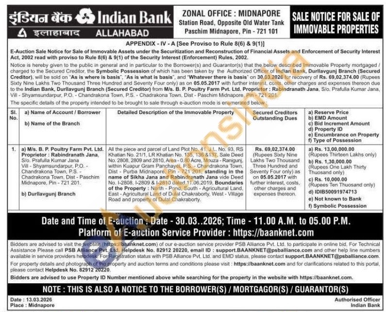 All the piece and parcel of Land Plot No. 41, J.L. No. 93. RS Khatian No. 21/1, LR Khalian No. 135, 136 &137, Sale Deed No. 2808, 2809 and 2810, Area-0.80 Acre, Mouza-Ranigunj, within Kuapur Gram Panchayet, P.S. Chandrakona Town Dist-Purba Midnapore. Pin-721 201, standing in the name of Sikha Jana and Rabindranath Jana vide Deed No. 1-2808, 1-2809 & 1-2810 dated 11.06.2019. Boundaries of the Property: North Pond, South-Agricultural Land, East Agricultural Land of Dulal Chakraborty, West-Village Road and property of Dulal Chakraborty
