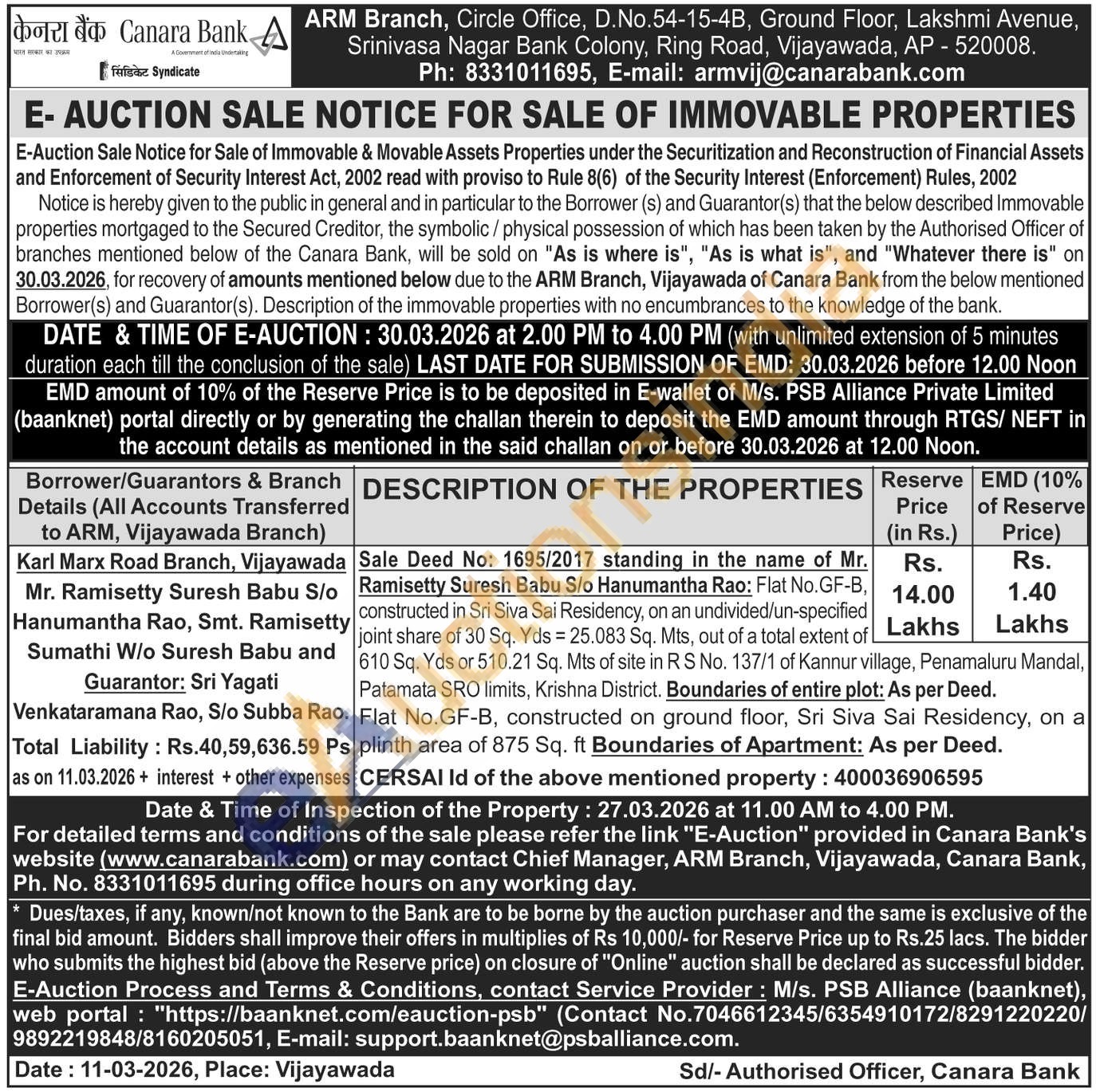 Sale Deed No: 1695/2017 standing in the name of Mr.Ramisetty Suresh Babu S/o Hanumantha Rao: Flat No.GF-B,constructed in Sri Siva Sai Residency, on an undivided/un-specified joint share of 30 Sq. Yds = 25.083 Sq. Mts, out of a total extent of 610 Sq. Yds or 510.21 Sq. Mts of site in RS No. 137/1 of Kannur village, Penamaluru Mandal, Patamata SRO limits, Krishna District. Boundaries of entire plot: As per Deed. Flat No.GF-B, constructed on ground floor, Sri Siva Sai Residency, on a plinth area of 875 Sq. ft Boundaries of Apartment: As per Deed. CERSAI Id of the above mentioned property: 400036906595