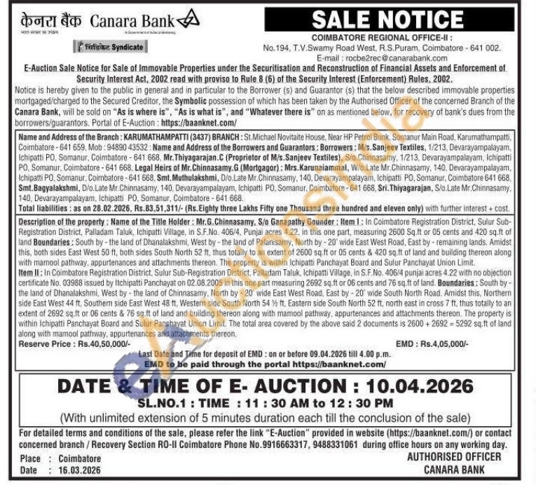 Item 1: In Coimbatore Registration District, Sulur Sub-Registration District, Palladam Taluk, Ichipatti Village, in S.F.No. 406/4, Punjal acres 4.22, in this one part, measuring 2600 Sq.ft or 05 cents and 420 sq.ft of land Boundaries: South by the land of Dhanalakshmi, West by the land of Palanisamy, North by - 20' wide East West Road, East by-remaining lands. Amidst this, both sides East West 50 ft, both sides South North 52 ft, thus totally to an extent of 2600 sq.ft or 05 cents & 420 sq.ft of land and building thereon along with mamool pathway, appurtenances and attachments thereon. The property is within Ichipatti Panchayat Board and Sulur Panchayat Union Limit. Item II: In Coimbatore Registration District, Sulur Sub-Registration District, Palladam Taluk, Ichipatti Village, in S.F.No. 406/4 punjai acres 4.22 with no objection certificate No. 03988 issued by Itchipatti Panchayat on 02.08.2005 in this one part measuring 2692 sq.ft or 06 cents and 76 sq.ft of land. Boundaries: South by-The land of Dhanalakshmi, West by the land of Chinnasamy, North by 20' wide East West Road, East by -20' wide South North Road, Amidst this, Northern side East West 44 ft, Southern side East West 48 ft. Western side South North 54% ft. Eastern side South North 52 ft, north east in cross 7 ft, thus totally to an extent of 2692 sq.ft or 06 cents & 76 sq.ft of land and building thereon along with mamool pathway, appurtenances and attachments thereon. The property is within Ichipatti Panchayat Board and Sulur Panchayat Union Limit. The total area covered by the above said 2 documents is 2600+26925292 sq.ft of land along with mamool pathway, appurtenances and attachments thereon.