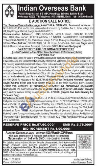 Schedule of Secured Assets SCHEDULE OF PROPERTIES ALONG WITH BOUNDARIES.A that piece and parcel of the residential house bearing H. No: 2-178/P-13(PTIN No. 1200801426). built on Plot No. 13, admeasuring an area of 180 Sq. Yds or 150.55 Sq. Mtrs and having with built up area of 900 Sq. feet with RCC Roof in Sree Viswamthra Enclave-ll in Survey No. 68/A AA,E situated at Tormur Village, Abdullapurmet Revenue Mandal (formerly Hayathnagar Revenue Mandal), under Turkayamjal Municipality (formerly Tomur Grampanchayath), Ranga Reddy District, Telangana 500511 Bounded