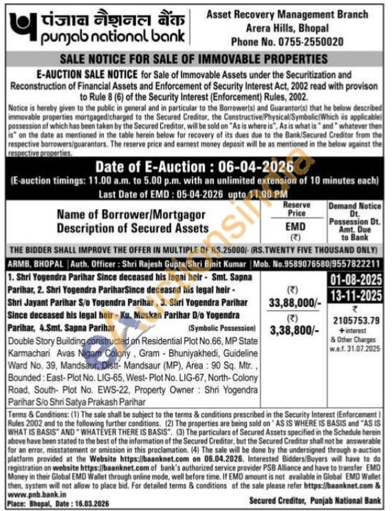 Double Story Building constructed on Residential Plot No.66, MP State Karmachari Avas Nigam Colony, Gram Bhuniyakhedi, Guideline Ward No. 39, Mandsaur, Distt- Mandsaur (MP), Area: 90 Sq. Mtr., Bounded: East-Plot No. LIG-65, West-Plot No. LIG-67, North-Colony Road, South Plot No. EWS-22, Property Owner: Shri Yogendra Parihar S/o Shri Satya Prakash Parihar