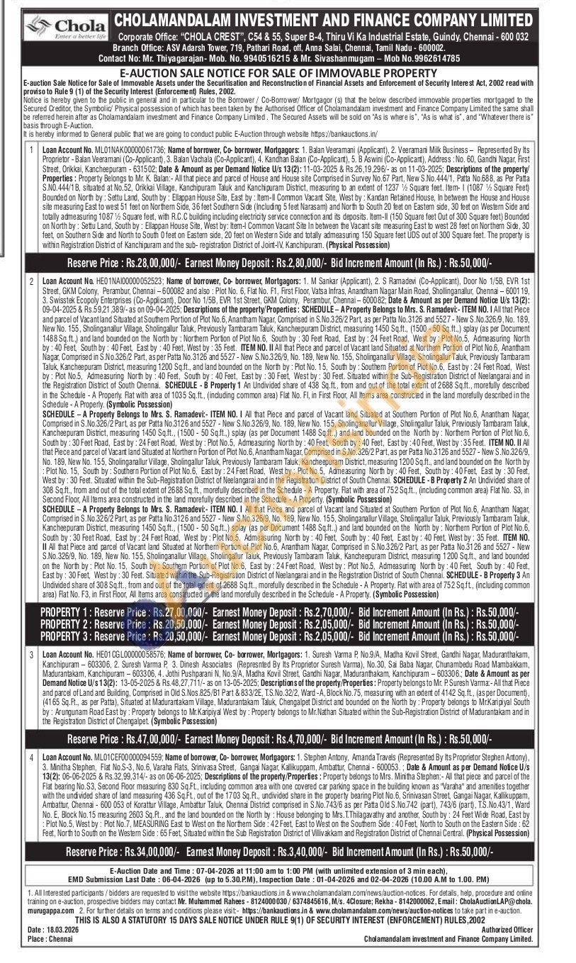 4) Property belongs to Mrs. Minitha Stephen:- All that piece and parcel of the Flat bearing No.S3, Second Floor measuring 830 Sq. Ft, including common area with one covered car parking space in the building known as "Varaha" and amenites together with the undivided share of land measuring 436 Sq.Ft, out of the 1703 Sq. Ft, undivided share in the property bearing Plot No.6, Srinivasan Street, Gangai Nagar, Kalikuppam, Ambattur, Chennai-600 053 of Korattur Village, Ambattur Taluk, Chennai District comprised in S.No. 743/6 as per Patta Old S. No.742 (part), 743/6 (part), TS.No.43/1, Ward No. E, Block No. 15 measuring 2603 Sq. Ft., and the land bounded on the North by House belonging to Mrs. I Thilagavathy and another, South by: 24 Feet Wide Road, East by Plot No.5, West by: Plot No. 7, MEASURING East to West on the Northem Side: 42 Feet, East to West on the Southem Side: 40 Feet, North to South on the Eastern Side: 62 Feet, North to South on the Western Side: 65 Feet Situated within the Sub Registration District of Villivakkam and Registration District of Chennai Central. (Physical Possession