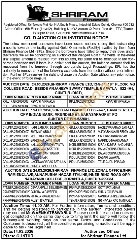 Shriram Finance Ltd Gold Auctions Auction in Bapatla