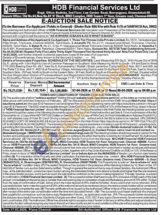 Details of Immovable Properties: SCHEDULE OF THE SECURITIES: Land Measuring 870 Sq.ft. With House Out of 3000 Sq.ft along with 1/3rd Right to Use of Common Passage on Southern Side Measuring North to South-5ft and East to West 71 ft (355) Bearing Door No. 49/1, New No.8, Kumarasamy (Mudali) Street, perambur Comprised in S.Nos. 461/1 and 465, as Per Patta T.S.Nos. 464/11,465/18 at Perambur Village. Admeasuring East to west On Northern Side-29 Feet, East to West on Southern Side-29 Feet, North to South on the Eastern Side-30 Feet, North to South on the western Side-30 Feet. Situated within the Sub Registration District of Purasawalkkam and Registration District of Chennai central BOUNDARIES Northby-Plot no.50, Southby-Plot no.51, Eastby-Common Passage 71°F15F: & Mrs. Ramachandran Property Westby-Platno.80.