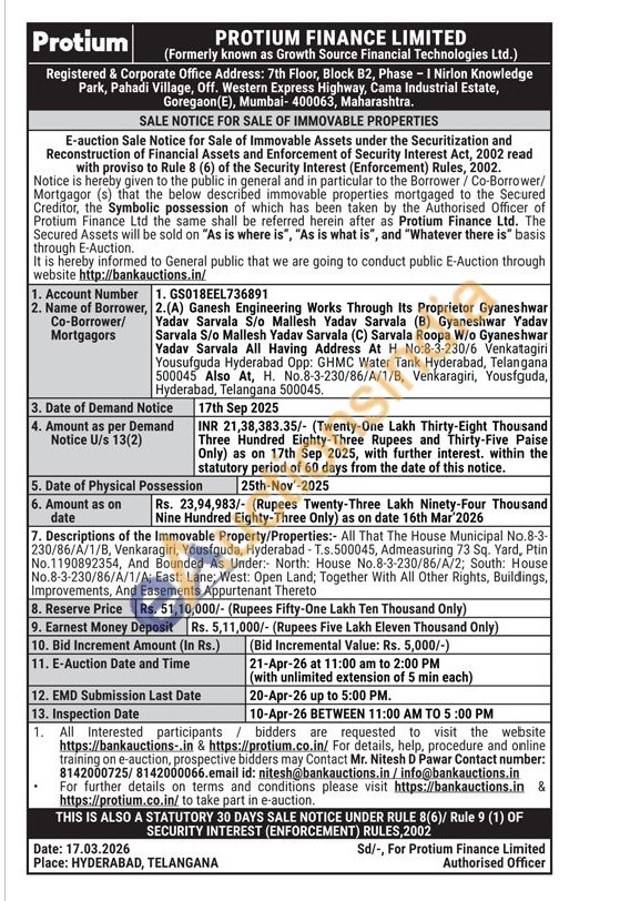 Descriptions of the Immovable Property/Properties:- All That The House Municipal No.8-3-230/86/A/1/B, Venkaragiri, Yousfguda, Hyderabad - T.s.500045, Admeasuring 73 Sq. Yard, Ptin No.1190892354, And Bounded As Under: North: House No.8-3-230/86/A/2; South: House No.8-3-230/86/A/1/A; East: Lane; West: Open Land; Together With All Other Rights, Buildings, Improvements, And Easements Appurtenant Thereto