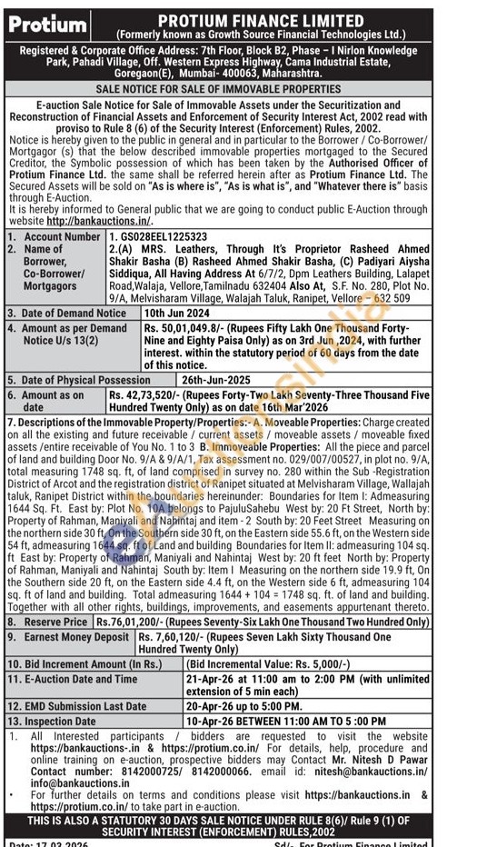 Descriptions of the Immovable Property/Properties:- A. Moveable Properties: Charge created on all the existing and future receivable / current assets / moveable assets / moveable fixed assets/entire receivable of You No. 1 to 3 B. Immoveable Properties: All the piece and parcel of land and building Door No. 9/A & 9/A/1, Tax assessment no. 029/007/00527, in plot no. 9/A, total measuring 1748 sq. ft, of land comprised in survey no. 280 within the Sub-Registration District of Arcot and the registration district of Ranipet situated at Melvisharam Village, Wallajah taluk, Ranipet District within the boundaries hereinunder: Boundaries for Item I: Admeasuring 1644 Sq. Ft. East by: Plot No. 10A belongs to PajuluSahebu West by: 20 Ft Street, North by: Property of Rahman, Maniyali and Nahintaj and item-2 South by: 20 Feet Street Measuring on the northern side 30 ft, On the Southern side 30 ft, on the Eastern side 55.6 ft, on the Western side 54 ft, admeasuring 1644 sq. ft of Land and building Boundaries for Item II: admeasuring 104 sq. ft East by: Property of Rahman, Maniyali and Nahintaj West by: 20 ft feet North by: Property of Rahman, Maniyali and Nahintaj South by: Item I Measuring on the northern side 19.9 ft, On the Southern side 20 ft, on the Eastern side 4.4 ft, on the Western side 6 ft, admeasuring 104 sq. ft of land and building. Total admeasuring 1644 + 1041748 sq. ft. of land and building. Together with all other rights, buildings, improvements, and easements appurtenant thereto