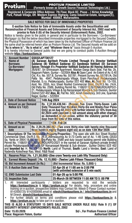 Descriptions Of The Immovable Property/Properties:- The open site with Acc Sheet Roofed Commercial Shed, Div/R.S No. 74-A, Admeasuring Ac 0-73 Cents out of Ac. 1-46 Cents (3533 Sq. Yards or 2954.18 Sq. Mtr), Old Patta No. 2589 and duly issued building permit vide Building Permit No. 1168/0112/B/PDNKURDU/KPD/2021 in the named of Saravan Agritech private lirnited situate Pedakurapadu Village & GP Narsaraopet Mandal & Sub division, Guntor District 522 402 and bounded by: H. No. 13-155 North: Land of Thumati, South: Land o Vendee, East: Land of Nadendla Koteshwar Rao, West: R&B Road