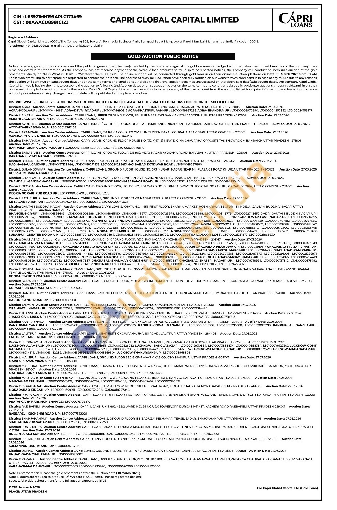 Capri Global Capital Limited Gold Auctions Auction in Agra