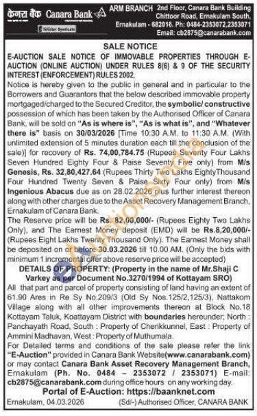 All that part and parcel of property consisting of land having an extent of 61.90 Ares in Re Sy No.209/3 (Old Sy Nos. 125/2,125/3), Nattakom Village along with all other improvements thereon at Block No.18 Kottayam Taluk, Koattayam District with boundaries hereunder, North: Panchayath Road, South: Property of Cherikkunnel, East: Property of