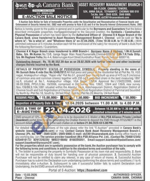 All that piece and parcel of the residential flat at Plot No. 19, VGS nagar, Anakaputhur village, "Rajan villa" Flat No.G1, ground floor having built up area of 475 sq.ft (inclusive of common area and common shares) together with 235 sq.ft undivided share in the land measuring 1897 sq.ft. situated at No.1. Anakaputhur village, VGA Nagar, CMDA Approval No.L1/3422/2006, dated 06.03.2006, PPD/LO.No. 19/2006, comprised in Old Survey Nos. 139/2, 139/4 and 139/9, new survey Nos. 139/88,9,10A, 1081 situated within the Alandur Taluk, Kancheepuram District, Registration District of Chennai South and Sub Registration of Chennai South and Sub Registration District of Pammal and bounded by North by : Plot No. 18, South by :24 feet Road, East by : Plot No.20, West by 24 feet Road.