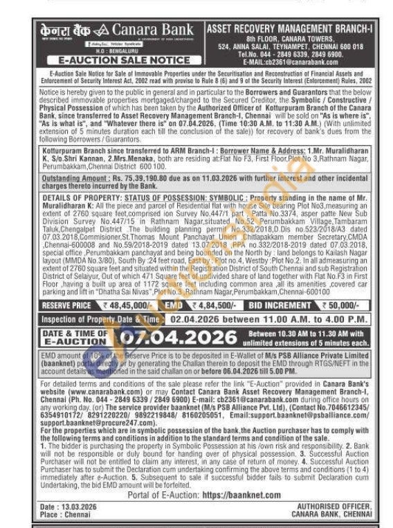 All the piece and parcel of Residential flat with house Site bearing Plot No3, measuring an extent of 2760 square feet,comprised ion Survey No.447/1 part, Patta No.3374, asper patte New Sub Division Survey No.447/15 in Rathnam Nagar,situated No.52 Perumbakkam Village, Tambaram Taluk, Chengalpet District The building planning permit No.332/2018.D. Dis no. 523/2018/A3 dated 07.03.2018,Commisioner, St. Thomas Mount Panchayat Union Chitlapakkam member Secretary, CMDA Chennai-600008 and No.59/2018-2019 dated 13.07.2018,PPA по 332/2018-2019 dated 07.03.2018, special office Perumbakkam panchayat and being bounded on the North by land belongs to Kailash Nagar layout (MMDA No. 3/80), South By : 24 feet road, East by: Plot no.4, Westby: Plot No.2. In all admeasuring an extent of 2760 square feet and situated within the Registration District of South Chennai and sub Registration District of Selaiyur, Out of which 471 Square feet of undivided share of land together with Plat No.F3 in First Floor having a built up area of 1172 square feet including common area all its amenities covered car parking and lift in "Dhatha Sai Nivas", Plot No.3, Rathnam Nagar, Perumbakkam, Chennai-600100