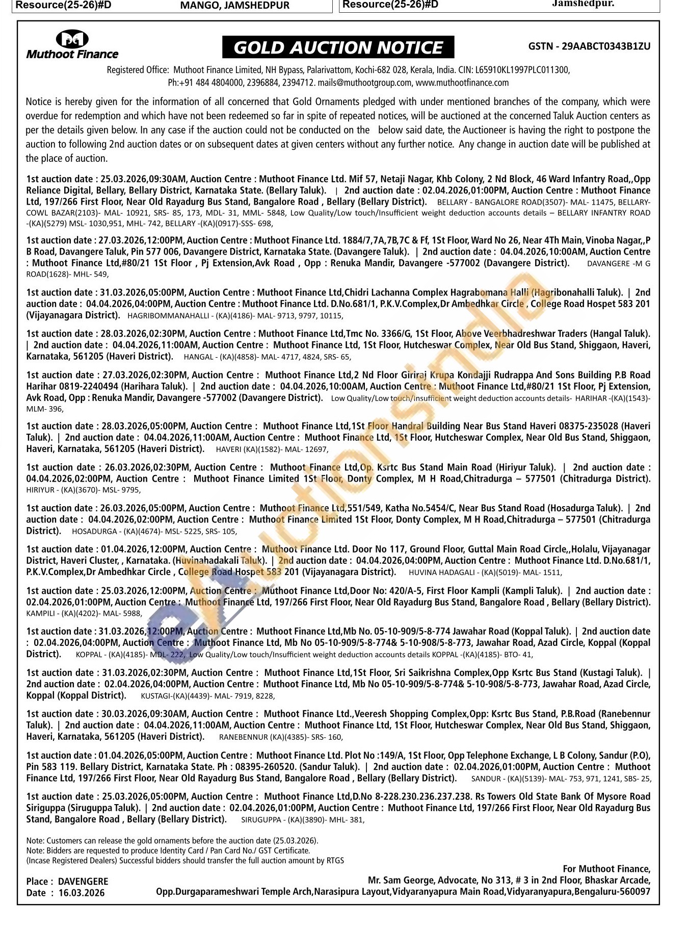 Muthoot Finance Ltd Gold Auctions Auction in Ballari