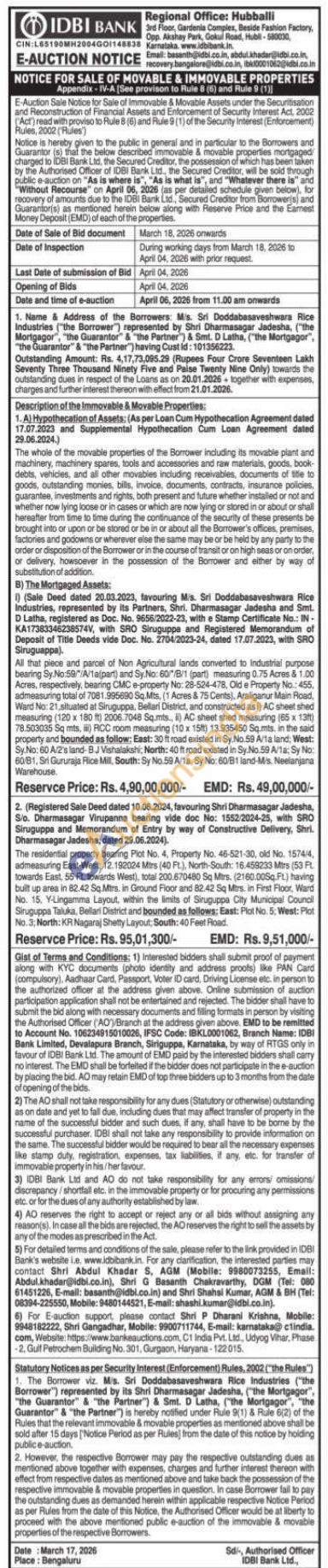 1. A) Hypothecation of Assets: All that piece and parcel of Non Agricultural lands converted to Industrial purpose bearing Sy.No:59"/A/1a(part) and Sy.No: 60/B/1 (part) measuring 0.75 Acres & 1.00 Acres, respectively, bearing CMC e-property No: 28-524-478, Old e Property No.: 455, admeasuring total of 7081.995690 Sq.Mts, (1 Acres & 75 Cents), Araliganur Main Road, Ward No: 21, situated at Siruguppa, Bellari District, and constructed as i) AC sheet shed measuring (120 x 180 ft) 2006.7048 Sq.mts., i) AC sheet shed measuring (65 x 13ft) 78.503035 Sq mts, ii) RCC room measuring (10 x 15ft) 13.935450 Sq.mts, in the said property and bounded as follow: East: 30 ft road existed in Sy No.59 A/la land; West: Sy.No: 60 A/2's land-BJ Vishalakshi, North: 40 ft road existed in Sy.No.59 A/1a: Sy No: 60/81, Sri Gururaja Flice Mill, South: Sy No.59 A/1a, Sy No: 60/B1 land-Mis. Neelanjana Warehouse.