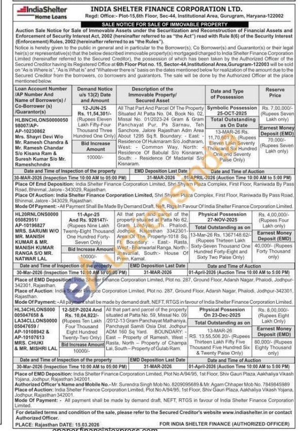 Contact Authorized Officer's Name and Mobile No.-Mr. Surendra Singh Mob No. 8209095689 & Mr. Agam Chhaper Mob No. 7849845989