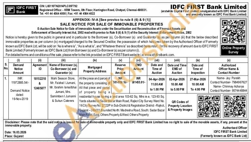 All the piece and parcel of the property consisting of All that piece and parcel of property being residential house having a land area 103-62 Sq. Mtrs ie e, 123-93 Sq. Yards situated at Sadar Bazar Main Road, Rajkot City Survey Ward No. 16 City Survey No. 2722/P in Sub-District & Registration District-Rajkot, Gujarat-360001 Bounded: North: Madresha Road, South: Sadar Bazar Main Road, East: Others Property & West: Others Property