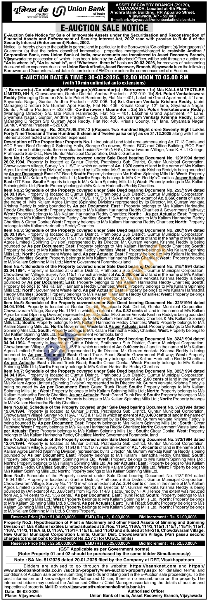 Description of The Properties: Property No.1: Industrial Land total area admeasuring Ac. 17.13 Cents and ACC Sheet Roof Ginning & Spinning Halls, Storage Go downs, Sheds, RCC roof Office Building, RCC Roof Staff Quarter buildings etc. thereon situated beside NH-16 (NH-5), Chowdavaram Village, Near K.H.I.T College, Prathipadu Sub-Dist., New Guntur Municipal Corporation, District Guntur in: Item No.1: Schedule of the Property covered under Sale Deed bearing Document No. 129/1994 dated 26.02.1994. Property is located at Guntur District, Prathipadu Sub District, Guntur Municipal Corporation, Chowdavaram Village, Survey No. 115/C in which an extent of Ac. 1.970 cents of land in the name of M/s Kallam Agros Limited (Spinning Division) represented by its Director, Mr. Gurram Venkata Krishna Reddy is being bounded by As per Document: East: GT Road; South: Property belongs to M/s Kallam Spinning Mills Ltd; West: Property belongs to M/s Kallam Spinning Mills Ltd.; North: Property belongs to M/s K.H. Reddy's Charities. As per Actuals: East: GT Road; South: Property belongs to M/s Kallam Spinning Mills Ltd.; West: Property belongs to M/s Kallam Spinning Mills Ltd.; North: Property belongs to M/s Kallam Harinadha Reddy Charities. Item No.2: Schedule of the Property covered under Sale Deed bearing Document No. 255/1994 dated 24.03.1994. Property is located at Guntur District, Prathipadu Sub District, Guntur Municipal Corporation, Chowdavaram Village, Survey No. 116/A, 116/B, 116/D & 115/A in which an extent of Ac. 2.660 cents of land in the name of M/s Kallam Agros Limited (Spinning Division) represented by its Director, Mr. Gurram Venkata Krishna Reddy is being bounded by As per Document: East: Property belongs to M/s Kallam Harinadha Reddy Charities; South: Property belongs to M/s Kallam Harinadha Reddy Charities & Government Pathway; West: Property belongs to M/s Kallam Harinadha Reddy Charities; North: As per Actuals: East: Property belongs to M/s Kallam Harinadha Reddy Charities; South: Property belongs to M/s Kallam Harinadha Reddy Charities & Circar Donka; West: Property belongs to M/s Kallam Harinadha Reddy Charities; North: Property belongs to M/s Kallam Harinadha Reddy Charities Item No.3: Schedule of the Property covered under Sale Deed bearing Document No. 280/1994 dated 28.03.1994. Property is located at Guntur District, Prathipadu Sub District, Guntur Municipal Corporation, Chowdavaram Village, Survey No. 115/1 in which an extent of Ac. 2.600 cents of land in the name of M/s Kallam Agros Limited (Spinning Division) represented by its Director, Mr. Gurram Venkata Krishna Reddy is being bounded by As per Document: East: Property belongs to M/s Kallam Harinadha Reddy Charities; South: Property belongs to M/s Kallam Harinadha Reddy Charities; West: Property belongs to M/s Kallam Spinning Mills Ltd.; North: Government Waste land. As per Actuals: East: Property belongs to M/s Kallam Harinadha Reddy Charities; South: Property belongs to M/s Kallam Harinadha Reddy Charities; West: Property belongs to M/s Kallam Spinning Mills Ltd.; North: Government Poramboku land