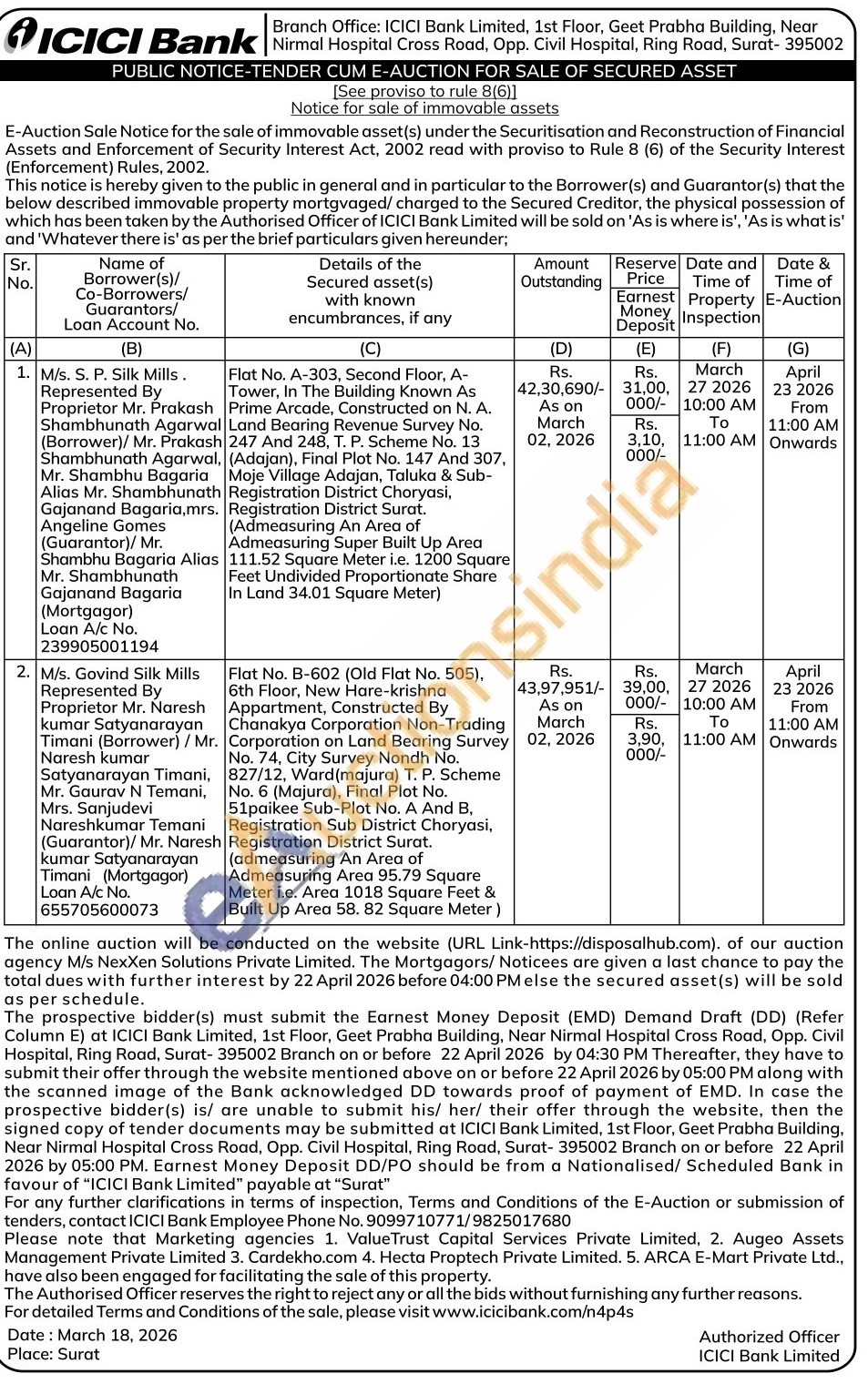 Flat No. B-602 (Old Flat No. 505), 6th Floor, New Hare-krishna Appartment, Constructed By Chanakya Corporation Non-Trading Corporation on Land Bearing Survey No. 74, City Survey Nondh No. 827/12, Ward(majura) T. P. Scheme No. 6 (Majura), Final Plot No. 51paikee Sub-Plot No. A And B. Registration Sub District Choryasi, Registration District Surat. (admeasuring An Area of Admeasuring Area 95.79 Square Meter i.e. Area 1018 Square Feet & Built Up Area 58. 82 Square Meter)