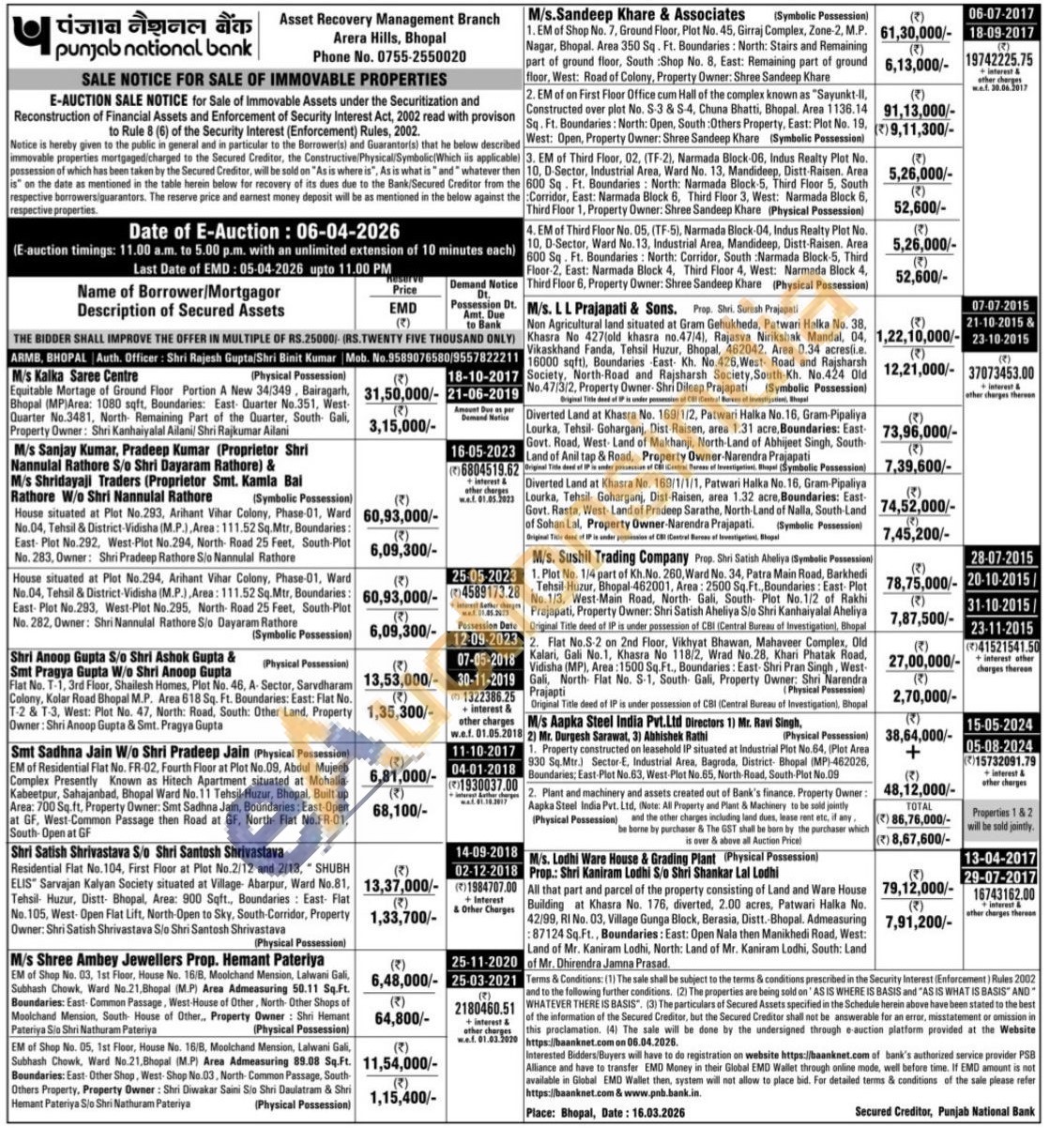 Non Agricultural land situated at Gram Gehukheda, Patwari Halka No. 38, Khasra No 427(old khasra no.47/4), Rajasva Nirikshak Mandal, 04, Vikaskhand Fanda, Tehsil Huzur, Bhopal, 462042. Area 0.34 acres(i.e. 16000 sqft), Boundaries East- Kh. No.426, West Road and Rajsharsh Society, North-Road and Rajsharsh Society, South-Kh. No.424 Old No.47/3/2, Property Owner- Shri Dileep Prajapati (Symbolic Possession) Original Title deed of is under of Central Bures of Investigation Thapal Rajsharsh