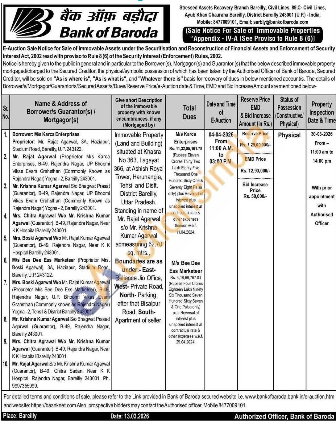 Immovable Property (Land and Building) situated at Khasra No 363, Lagayat 366, at Ashish Royal Tower, Harunangla, Tehsil and Distt. District Bareilly, Uttar Pradesh. Standing in name of Mr. Rajat Agarwal s/o Mr. Krishna Kumar Agarwal Kadmeasuring 62.70 sq. mtrs