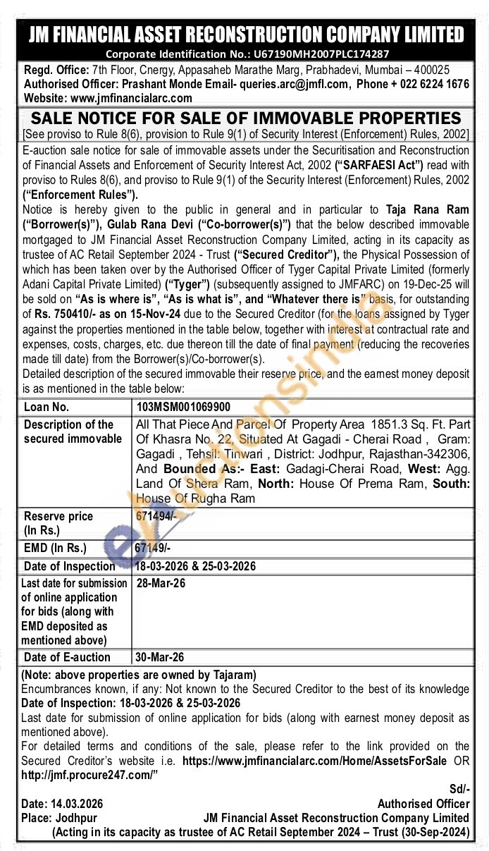 All That Piece And Parcel Of Property Area 1851.3 Sq. Ft. Part Of Khasra No. 22, Situated At Gagadi - Cherai Road, Gram: Gagadi, Tehsil: Tinwari, District: Jodhpur, Rajasthan-342306, And Bounded As:- East: Gadagi-Cherai Road, West: Agg. Land Of Shera Ram, North: House Of Prema Ram, South: House Of Rugha Ram