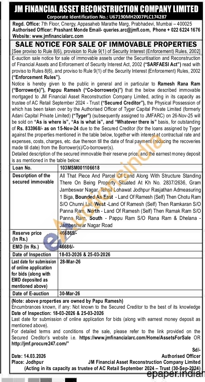 All That Piece And Parcel Of Land Along With Structure Standing There On Being Property Situated At Kh No. 2837/2636, Gram Jambeswar Nagar, Tehsil Lohawat Jodhpur Rasjathan Admeasuring 1 Biga, Bounded As East - Land Of Ramesh (Self) Then Chotu Ram S/O Chunni Lal, West -Land Of Ramesh (Self) Then Ramkaran S/O Panna Ram, North - Land Of Ramesh (Self) Then Ramak Ram S/O Panna Ram, South Pappu Ram S/O Rana Ram & Dhelana -Jambeshwar Nagar Road