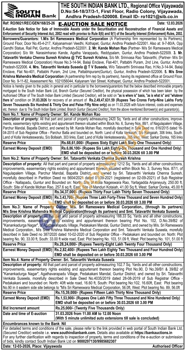 All that part and parcel of property admeasuring 2420 Sq. Yards and all other constructions, improve-ments, easementary rights existing and appurtenant thereon situated within Block No. 6, Survey Nos. 88/1, of Nagulapalem Village, Parchur Mandal, Bapatla District, and owned by Mr. Kande Mohan Rao, morefully described in Sale Deed no. 616/2015 dated 16-04-2015 of Sub Registrar Office - Parchur Batla and bounded on, North: Land of Kolla Venkaiah, S/o Rangaiah, 306 links, South: Land of Kolla Venkateswaralu, S/o Bollaiah, 303 links, East: Land of Kolla Venkateswaralu, 165 links, West: Sarkar Donka, 165 links