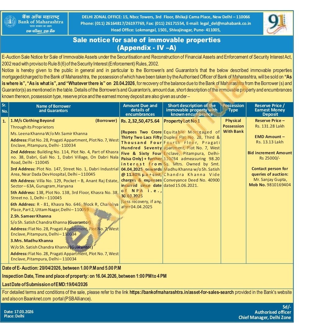 Equitable Mortgaged of Duplex Flat No. 28, Third & Fourth Floor, Pragati apartment, Plot No. 7, West Enclave, Pitampura, Delhi- 110034 admeasuring 98.20 Sq. Mtrs. Owned by Smt Madhu Khanna w/o Sh. Satish Chandra Khanna Vide Conveyance Deed No. 40900 dated 15.06.2021