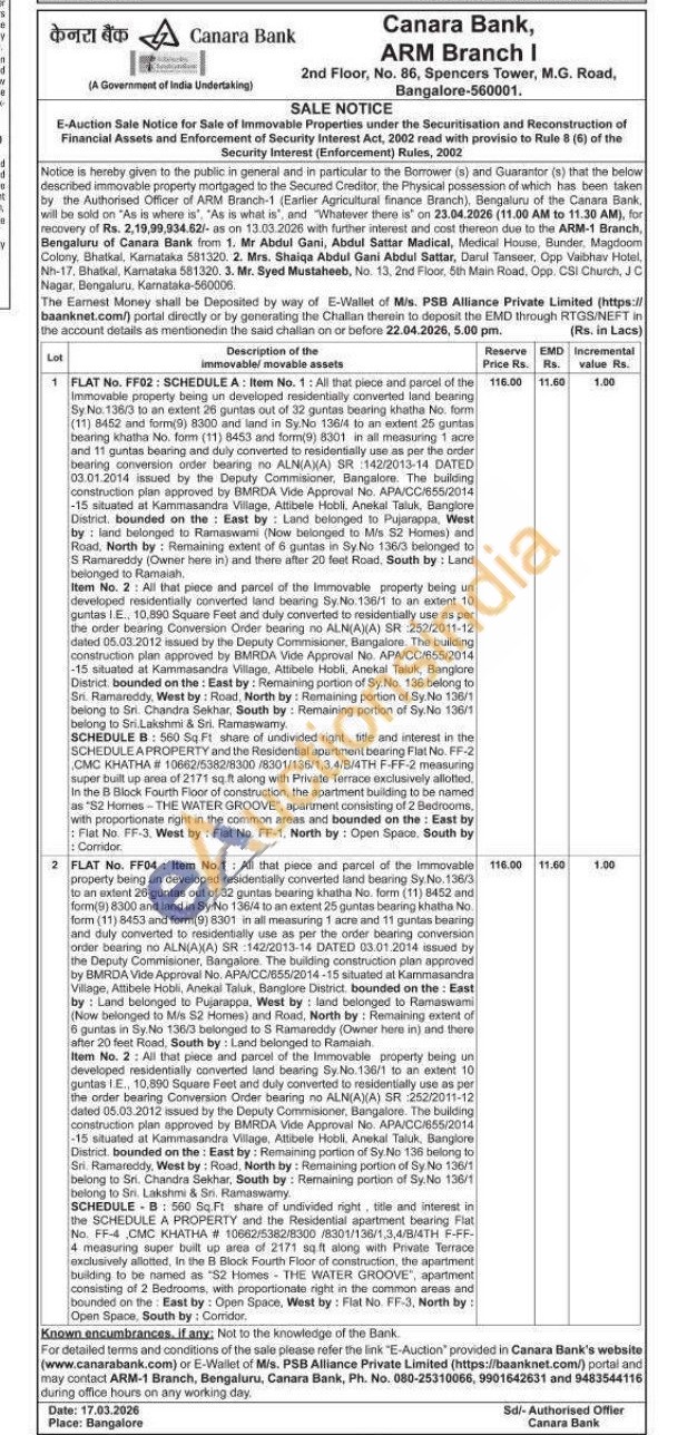 FLAT No. FF04 Item No.1: All that piece and parcel of the immovable property being un developed residentially converted land bearing Sy. No. 136/3 form (11) 8453 and form() to an extent 25 guntas out of 32 guntas bearing khatha No. form (11) 8452 and form(9) 8300 and land in Sy No 136/4 to an extent 25 guntas bearing khathe No. form (11) 8453 and form(9) 8301 in all measuring Tacre and 11 guntas bearing and duly converted to residentially use as per the order bearing conversion order bearing no ALN(AXA) SR 142/2013-14 DATED 03.01.2014 Issued by the Deputy Commisioner, Bangalore. The building construction plan approved by BMRDA Vide Approval No. APA/CC/655/2014-15 situated at Kannasandra Village, Athibele Hobli, Anekal Taluk, Banglore District. bounded on the East by: Land belonged to Pujarappa, West by land belonged to Ramaswami (Now belonged to Mis 82 Homes) and Road, North by: Remaining extent of 6 guntas in Sy No 130/3 belonged to S Ramareddy (Owner hers in) and there after 20 feet Road, South by: Land belonged to Ramaiah Item No. 2: All that piece and parcel of the Immovable property being un developed residentially converted land bearing Sy No. 136/1 to an extent 10 guntas 1, 10,890 Square Feet and duly converted to residentially use as per the order bearing Conversion Order bearing no ALN(A)(A) SR 252/2011-12 dated 05.03.2012 issued by the Deputy Commisioner, Bangalore. The building construction plan approved by BMRDA Vide Approval No. APA/CC/655/2014 15 situated at Kammasandra Village, Attibele Hobli, Anekal Taluk, Bangiore District, bounded on the East by: Remaining portion of Sy No 136 belong to Sri Ramareddy, West by: Road, North by: Remaining portion of Sy: No 136/1 belong to Sri. Chandra Sekhar, South by: Remaining portion of Sy No 136/1 belong to Sr. Lakshmi & Sn. Ramaswamy. SCHEDULE 8: 500 Sq Ft share of undivided right, ille and interest in the SCHEDULE A PROPERTY and the Residential apartment bearing Flat No. FF-4 CMC KHATHA # 10682/5382/8300/8301/136/1,3,4/B/4TH F-FF-4 measuring super built up area of 2171 sqft along with wit Private Terrace exclusively allotted, In the B Block Fourth Floor of construction, the apartment building to be named as "S2 Homes THE WATER GROOVE, apartment consisting of 2 Bedrooms, with proportionate right in the common areas and bounded on the East by: Open Space, West by: Flat No. FF-3, North by: Open Space South by: Comidor