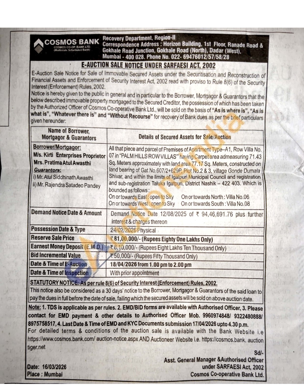All that piece and parcel of Premises of Apartment Type-A1, Row Villa No. 07 in "PALM HILLS ROW VILLAS" having Carpet area admeasuring 71.43 Sq. Meters approximately with land area 77.17 Sq. Meters, constructed on land bearing of Gat No.607/2+629P, Plot No.2 & 3, village Gonde Dumala Shivar, and within the limits of Igatpuri Municipal Council and registration and sub-registration Taluka Igatpuri, District Nashik - 422 403. Which is bounded as follows: On or towards East: open to Sky On or towards West: open to Sky On or towards North: Villa No.06 On or towards South: Villa No.08