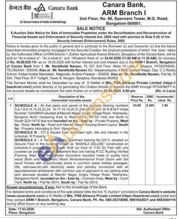 All that piece and parcel of the property bearing numbers 5,6,7,8,9,14,15,22,23,24, 16,17,18,19,20,21,254,26,27 and 28 B.B.M.P khata Number 1324/866/5 situated at Maruthi Nagar, Kogilu Village Road, Yelahanka, Banglore North measuring East to West 183.5+165.3/2 Feet and North to South 223+147/2 feet and bounded on the East by: Private Property, West by: Road, North by: Road and Maruthi Nagar Housing Board Layout, South by: Property belonging to Smt. Vijayamma. SCHEDULE B: 317.9 Square Feet undivided right, title and interest in the schedule 'A' Property. SCHEDULE C: A Two Bed Room Apartment bearing No.G013, situated on Ground Floor in the building Known as "MIDHILA DELUXE constructed on schedule-A property with a Super Built Up Area of 1135 Sq Feet with one covered car parking area in Basement floor and having R CC Roofing Vitrified Flooring, Main Door and shutter decorative moulded made of quality hard wood (Both side teak finish) Wood Windows/internal Flush Doors with Sal wood frames with proportionate share in common areas lobbies passages, lifts, staircase,etc, with electricity water and sanitary connection with all appurtenances whatsoever with common use of approach to car parking area and staircase situated at Maruthi Nagar, Kogilu Village Road, Yelahanka, Bangalore North, bounded on the East by: Common Area, West by: Court Yard, North by: Flat No G014, South by: Fiat No G012