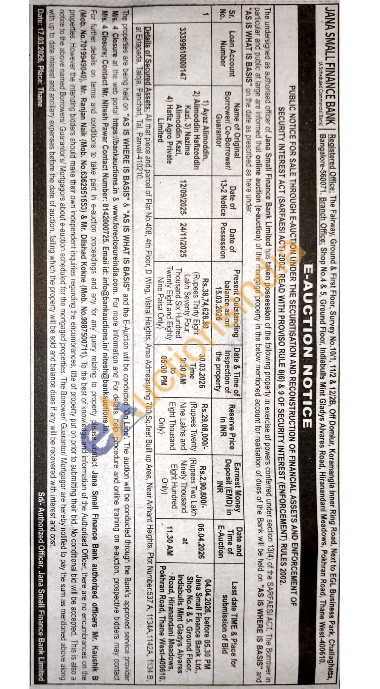 authorized officers Mr. Kaushik B (Mob. No.7019949040), Mr. Ranjan Naik (Mob. No.6362951653) & Mr. Dilshad Kokne (Mob. No.9987500711)
