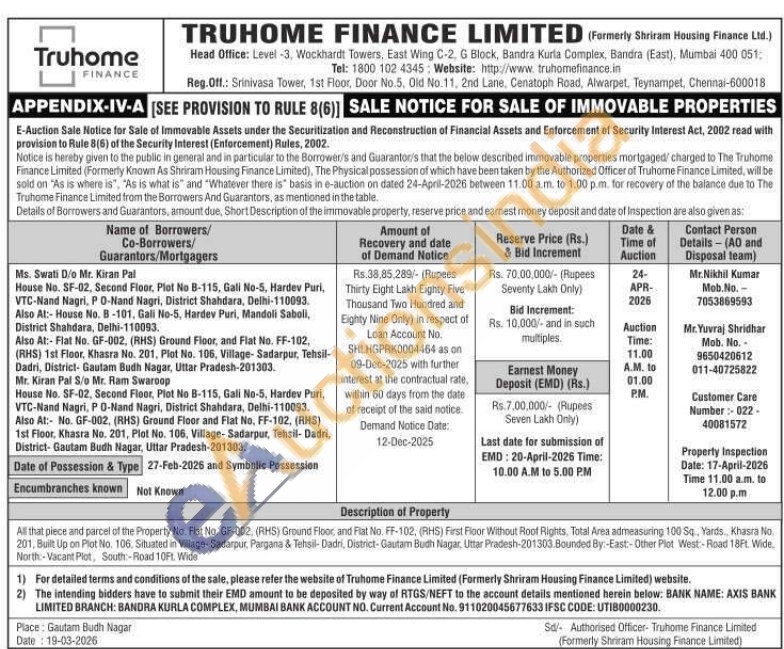 All that piece and parcel of the Property No. Flat No. GF-002, (RHS) Ground Floor, and Flat No. FF-102, (RHS) First Floor Without Roof Rights. Total Area admeasuring 100 Sq., Yards, Khasra No. 201, Built Up on Plot No. 106, Situated in Village- Sadarpur, Pargana & Tehsil-Dadri, District-Gautam Budh Nagar, Uttar Pradesh-201303 Bounded By:-East:-Other Plot West: Read 18Ft. Wide, North:-Vacant Plot, South-Road 10Ft. Wide