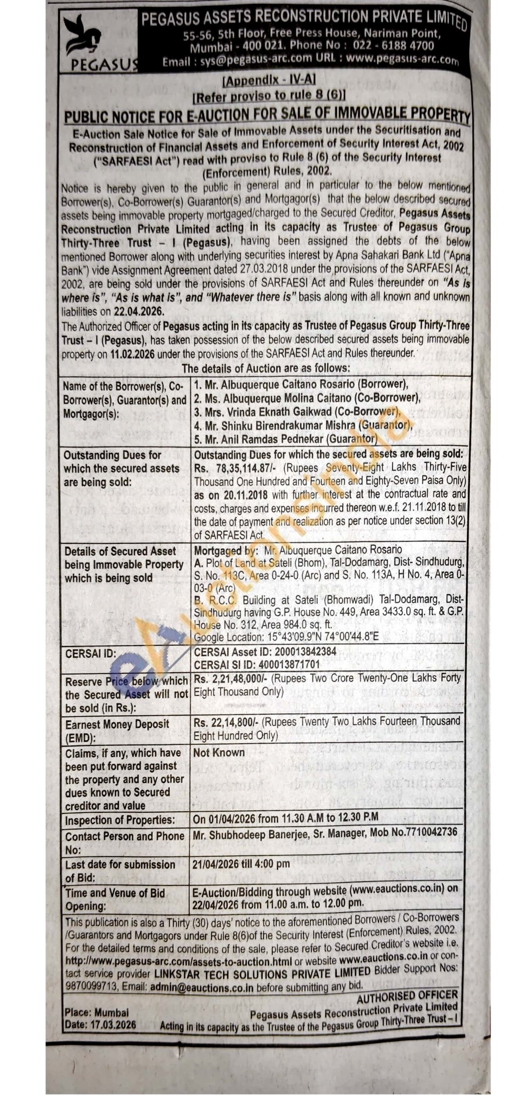 Mortgaged by: Mr. Albuquerque Caitano Rosario A. Plot of Land at Sateli (Bhom), Tal-Dodamarg, Dist- Sindhudurg, S. No. 113C Area 0-24-0 (Arc) and S. No. 113A, H No. 4, Area 0-03-0 (Arc) B. R.C.C. Building at Sateli (Bhomwadi) Tal-Dodamarg, Dist-Sindhudurg having G.P. House No. 449, Area 3433.0 sq. ft. & G.P. House No. 312, Area 984.0 sq. ft. Google Location: 15°43'09.9″N 74°00'44.8"E