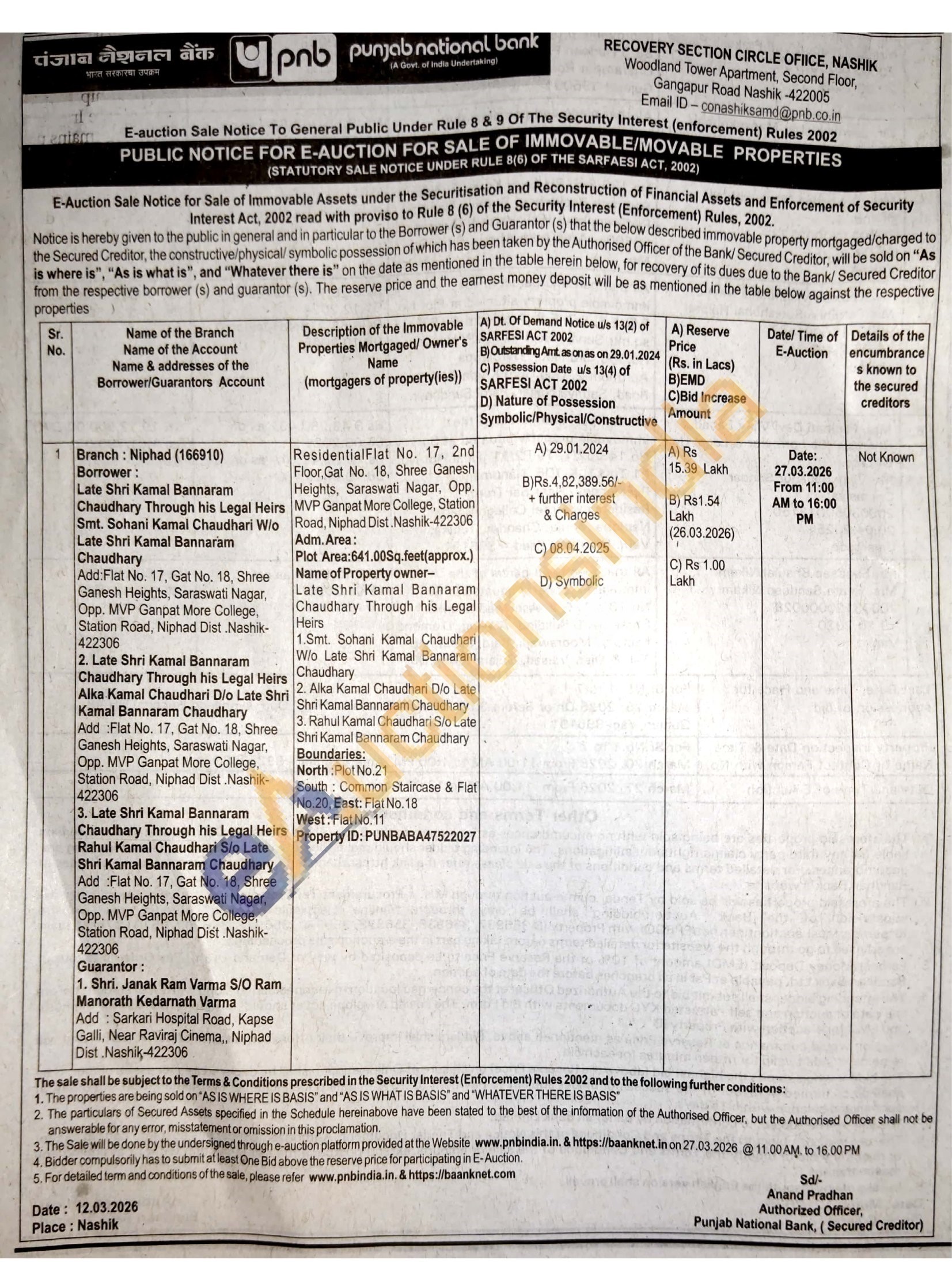 Residential Flat No. 17, 2nd Floor, Gat No. 18, Shree Ganesh Heights, Saraswati Nagar, Opp. MVP Ganpat More College, Station Road, Niphad Dist. Nashik-422306 Adm.Area: Plot Area:641.00Sq.feet(approx.) Name of Property owner- Late Shri Kamal Bannaram Chaudhary Through his Legal Heirs 1.Smt. Sohani Kamal Chaudhari W/o Late Shri Kamal Bannaram Chaudhary 2. Alka Kamal Chaudhari Dio Late Shri Kamal Bannaram Chaudhary 3. Rahul Kamal Chaudhari Sio Late Shri Kamal Bannaram Chaudhary Boundaries: North: Plot No.21 South Common Staircase & Flat No.20, East: Flat No. 18 West: Flat No. 11 Property ID: PUNBABA47522027