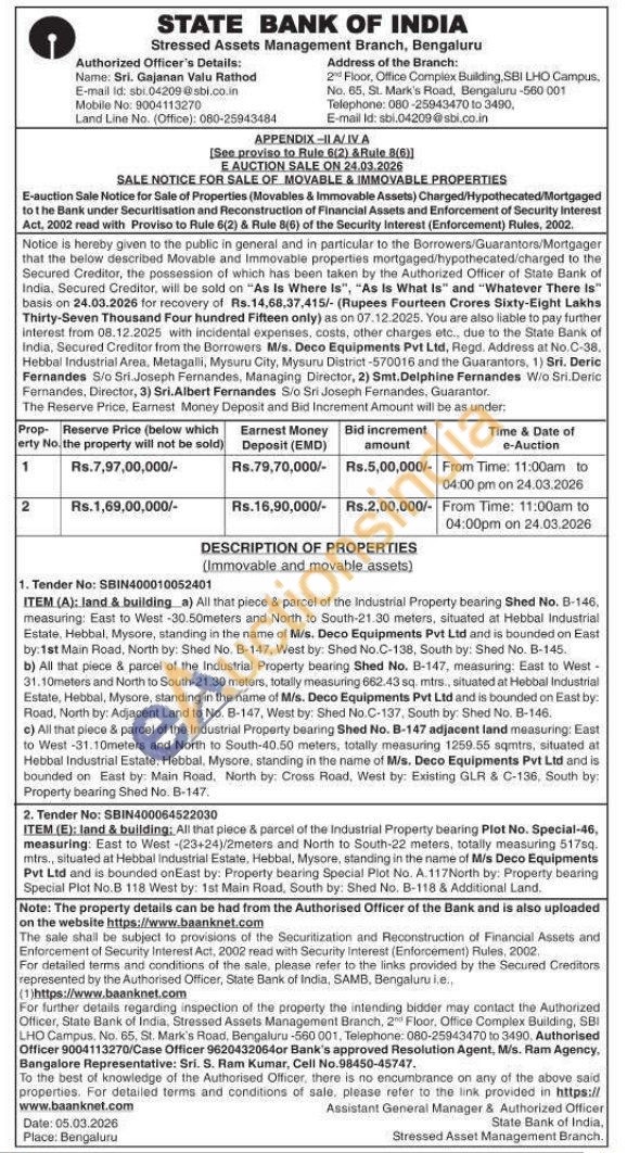 b) All that piece & parcel of the Industrial Property bearing Shed No. B-147, measuring: East to West -31.10meters and North to South-21.30 meters, totally measuring 662.43 sq, mtrs., situated at Hebbal Industrial Estate, Hebbal, Mysore, standing in the name of M/s. Deco Equipments Pvt Ltd and is bounded on East by: Road, North by: Adjacent Land to No. B-147, West by: Shed No.C-137, South by: Shed No. B-146. c) All that piece & parcel of the Industrial Property bearing Shed No. B-147 adjacent land measuring: East to West -31.10meters and North to South-40.50 meters, totally measuring 1259.55 sqmtrs, situated at Hebbal Industrial Estate, Hebbal, Mysore, standing in the name of Mis. Deco Equipments Pvt Ltd and is bounded on East by: Main Road, North by: Cross Road, West by: Existing GLR & C-136, South by: Property bearing Shed No. B-147.