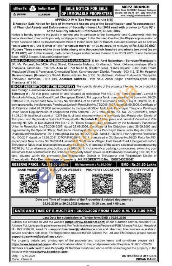 The specific details of the property intended to be brought to sale through e-auction mode are enumerated below Schedule A: All that piece parcel of land situated at residential Plot No.12, in "Times Square", Layout in Muttukadu Village, East Coast Road, Chengalpet District, Thirupporur Taluk, comprised in Old Survey No. 99/20, Patta No.793, as per patta New Survey No. 99/2081J, of an extent of 4 Grounds and 676 Sq. ft. (10276 Sq. ft.) duly approved by the Muttukadu Panchayat Union in Resolution No.75/2006-2007, dated 28.09.2006, Certificate of No Objection dated 28.09.2006 and regularized by the Special Officer, Muttukadu Panchayat, Thiruporur Panchayat Union under Regularization of unapproved Plots Scheme - 2017 through Na. Ka. No. 2970/2019/M1, dated 31.05.2019. In all total extent of 10276 Sq. ft. of land, situated within the previously Sub Registration District of Thiruporur and Registration District of Chengalpattu. Schedule B: All that piece and parcel of Vacant land Villa bearing No.12B. in Sub-divided Plot No. 12. in "Times Square", duly approved by the Muttukadu Panchayat Union in Resolution No. 75/2006-2007, dated 28.09.2006, Certificate of No Objection dated 28.09.2006 and regularized by the Special Officer, Muttukadu Panchayat, Thiruporur Panchayat Union under Regularization of Unapproved Plots Scheme-2017 through Na. Ka. No.2970/2019/M1, dated 31.05.2019. Plan Approved Resolution No. 100/2011 dated on 15.02.2011, DTCP/P/0028471/2017, comprised in Old Survey No. 99/20, Patta No. 793, as per patta New Survey No. 99/20B1J, situated at "Muttukadu Village", East Coast Road, Chengalpet District, Thirupporur Taluk, in all total extent measuring 5138 Sq. ft. of land (out of the above said total extent measuring 10276 Sq. ft.) on villa measuring built up area 3600 Sq. ft. inclusive of car parking, common area, swimming pool and others to be constructed in the Schedule A Property herein above. In all total extent measuring 5138 Sq. ft. of land, situated within the previously Sub Registration District of Thirupporur and Registration District of Chengalpattu. Prior Encumbrances on property: NII. PROPERTY ID No.: IDIB7545330347