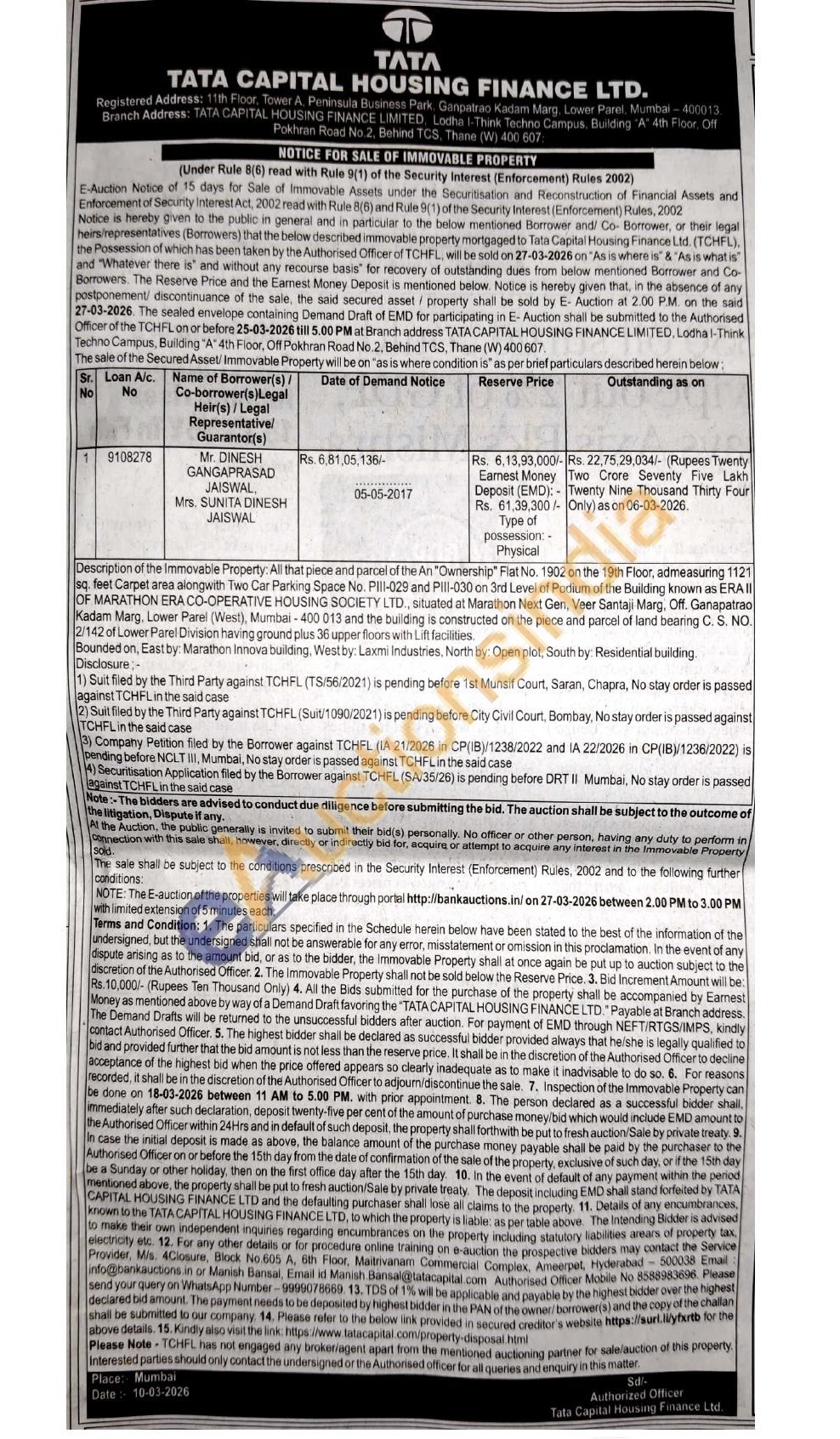 Description of the Immovable Property: All that piece and parcel of the An "Owriership" Flat No. 1902 on the 19th Floor, admeasuring 1121 sq. feet Carpet area alongwith Two Car Parking Space No. PIII-029 and Pill-030 on 3rd Level of Podium of the Building known as ERA II OF MARATHON ERA CO-OPERATIVE HOUSING SOCIETY LTD., situated at Marathon Next Gen, Veer Santaji Marg. Off. Ganapatrao Kadam Marg, Lower Parel (West), Mumbai-400 013 and the building is constructed on the piece and parcel of land bearing C. S. NO 2/142 of Lower Parel Division having ground plus 36 upper floors with Lift facilities. Bounded on, East by: Marathon Innova building, Westby: Laxmi Industries, North by: Open plot, South by: Residential building. Disclosure- 1) Suit filed by the Third Party against TCHFL (TS/56/2021) is pending before 1st Munsif Court, Saran, Chapra, No stay order is passed against TCHFL in the said case 2) Suit filed by the Third Party against TCHFL (Suit/1090/2021) is pending before City Civil Court, Bombay, No stay order is passed against TCHFL in the said case (3) Company Petition filed by the Borrower against TCHFL (IA 21/2026 in CP(IB)/1238/2022 and IA 22/2026 in CP(IB)/1236/2022) is pending before NCLT III, Mumbai, No stay order is passed against TCHFL in the said case 4) Securtisation Application filed by the Borrower against TCHFL (SA/35/26) is pending before DRT II Mumbai, No stay order is passed @gainst TCHFL in the said case