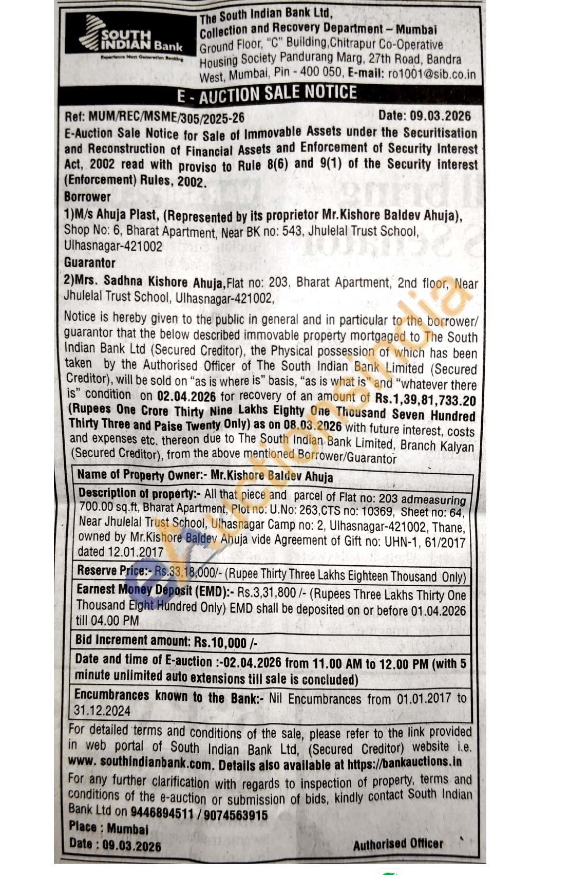 Description of property:- All that piece and parcel of Flat no: 203 admeasuring 700.00 sq.ft, Bharat Apartment, Plot no: U.No: 263,CTS no: 10369, Sheet no: 64, Near Jhulelal Trust School, Ulhasnagar Camp no: 2, Ulhasnagar-421002, Thane, owned by Mr.Kishore Baldev Ahuja vide Agreement of Gift no: UHN-1, 61/2017 dated 12.01.2017