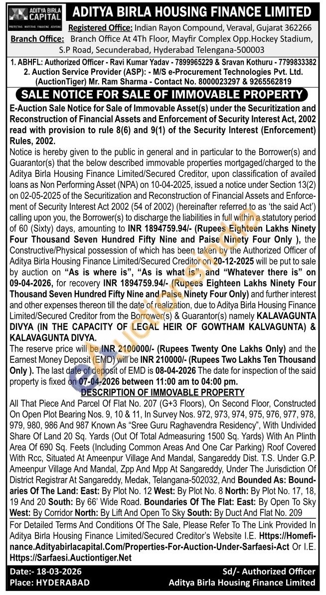 DESCRIPTION OF IMMOVABLE PROPERTY : All That Piece And Parcel Of Flat No. 207 (G+3 Floors), On Second Floor, Constructed On Open Plot Bearing Nos. 9, 10 & 11, In Survey Nos. 972, 973, 974, 975, 976, 977, 978, 979, 980, 986 And 987 Known As "Sree Guru Raghavendra Residency", With Undivided Share Of Land 20 Sq. Yards (Out Of Total Admeasuring 1500 Sq. Yards) With An Plinth Area Of 690 Sq. Feets (Including Common Areas And One Car Parking) Roof Covered With Rcc, Situated At Ameenpur Village And Mandal, Sangareddy Dist. T.S. Under G.P. Ameenpur Village And Mandal, Zpp And Mpp At Sangareddy, Under The Jurisdiction Of District Registrar At Sangareddy, Medak, Telangana-502032, And Bounded As: Bound-aries Of The Land: East: By Plot No. 12 West: By Plot No. 8 North: By Plot No. 17, 18, 19 And 20 South: By 66' Wide Road. Boundaries Of The Flat: East: By Open To Sky West: By Corridor North: By Lift And Open To Sky South: By Duct And Flat No. 209