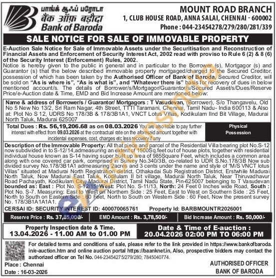 Description of the Immovable Property: All that piece and parcel of the Residential Villa bearing plot No.S-12 now subdivided in to S-12/14, admeasuring an extent of 1500Sq.feet out of house plots, together with residential individual house known as S-14 having super built up area of 985Square Feet, which includes a common area along with one covered car park, comprised in Survey No.340/3B, co-related to UDR S.No. 178/3B Now sub divided survey No.178/3B1A1 admeasuring 2acres and 3 cents under the name and style of "M/S VNCT lotus Villas" situated at Madurai North Registration district, Othakadai Sub Registration District, Erstwhile Madurai North Taluk, Now Madurai East Taluk, Kodilulam ilulam Il bit village, Madurai North Taluk, Near Thiruvad havur Road Pachayath, Kodikulam City, Madurai District, Tamil Nadu State, Pin-625007 belonging to T Vasudevan bounded as: East: Plot No. S-12/15, West: Plot No. S-11/13, North: 24 Feet 0 Inches wide Road, South: Plot No. S-7. Measuring: East to West on Northem Side: 25 Feet, East to West on Southern Side: 25 Feet, North to South on Eastern Side: 60 Feet, North to South on Westem Side: 60 Feet, Now the present survey No. 178/3B1A1A1A1.