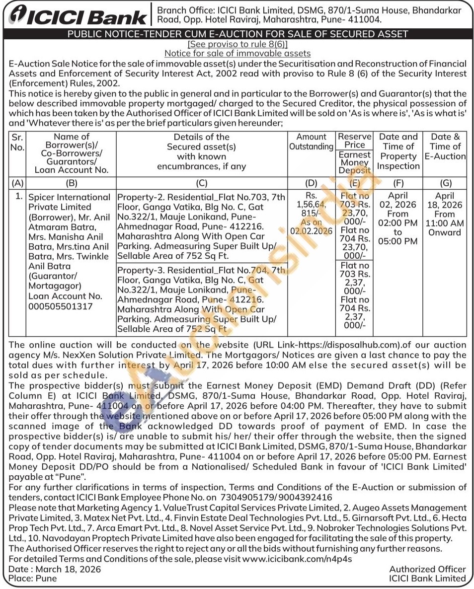 Property-3. Residential_Flat No.704, 7th Floor, Ganga Vatika, Blg No. C, Gat No.322/1, Mauje Lonikand, Pune-Ahmednagar Road, Pune-412216. Maharashtra Along With Open Car Parking. Admeasuring Super Built Up/Sellable Area of 752 Sq Ft