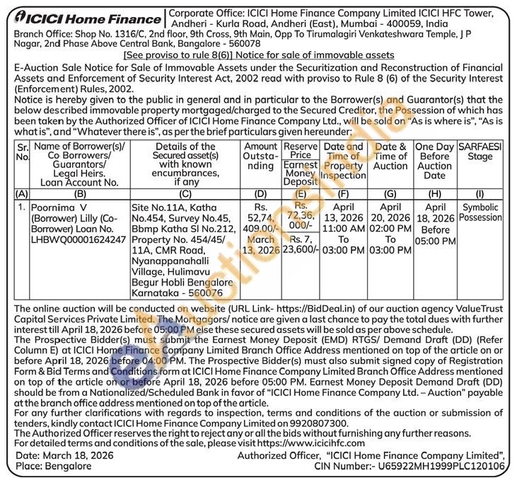 Site No.11A, Katha No.454, Survey No.45, Bbmp Katha Sl No.212, Property No. 454/45/11A, CMR Road, Nyanappanahalli Village, Hulimavu Begur Hobli Bengalore Karnataka 560076