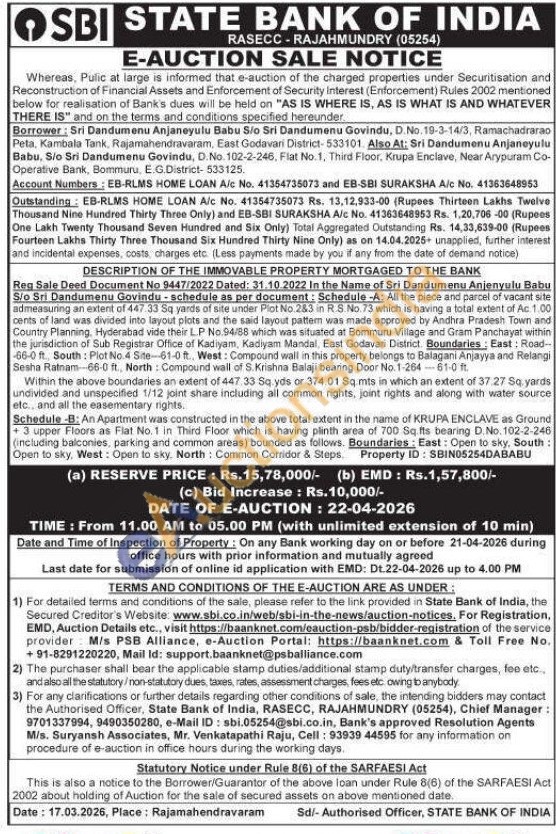 DESCRIPTION OF THE IMMOVABLE PROPERTY MORTGAGED TO THE BANK : Reg Sale Deed Document No 9447/2022 Dated: 31.10.2022 In the Name of Sri Dandumenu Anjenyulu Babu S/o Sri Dandumenu Govindu-schedule as per document: Schedule -A: All the piece and parcel of vacant site admeasuring an extent of 447.33 Sq yards of site under Plot No. 283 in R.S.No. 73 which is having a total extent of Ac 1.00 cents of land was divided into layout plots and the said layout pattem was made approved by Andhra Pradesh Town and Country Planning, Hyderabad vide their LP No.94/88 which was situated at Bommuru Village and Gram Panchayat within the jurisdiction of Sub Registrar Office of Kadiyam, Kadiyam Mandal, East Godavari District. Boundaries: East: Road--66-0 ft., South: Plot No.4 Site--61-0 ft., West: Compound wall in this property belongs to Balagani Anjayya and Relangi Sesha Ratnam-66-0 ft., North Compound wall of S. Krishna Balaji bearing Door No.1-264-61-0 ft