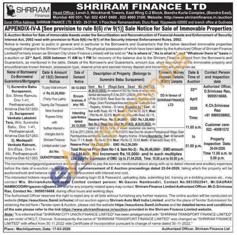 Authorized Officer, Mr.D.Srinivasa Rao, Contact No : 9959516668 / K.Ch.Srinivasa Rao - +91 9989338862 / Customer care: 022-40081572