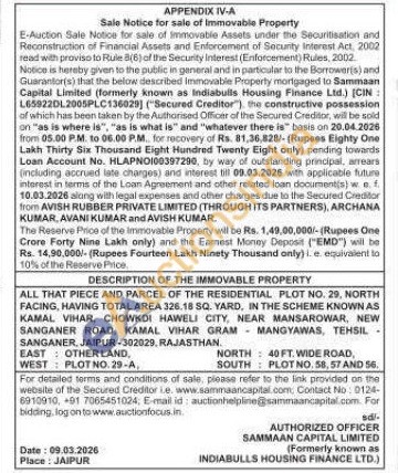 ALL THAT PIECE AND PARCEL OF THE RESIDENTIAL PLOT NO. 29, NORTH FACING, HAVING TOTAL AREA 326.18 SQ. YARD, IN THE SCHEME KNOWN AS KAMAL VIHAR, CHOWKDI HAWELI CITY, NEAR MANSAROWAR, NEW SANGANER ROAD, KAMAL VIHAR GRAM MANGYAWAS, TEHSIL SANGANER, JAIPUR-302029. RAJASTHAN.
