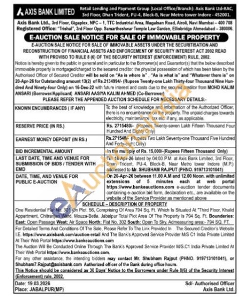 One Residential FL995a]t No. 301 On Plot. 56, Comprising Of Area 794 Sq. Ft. Which Is Situated At "Third Floor, Khalid Appartment, Chitranjan Ward, Mouza-Betia. Jabalpur Total Plot Area Of The Property is 794 Sq. Ft. Bounderies: East: Open Passage West: Air Space North: Flat No. 302 South: Open To Sky. Admeasuring area-794 SQ. FT.